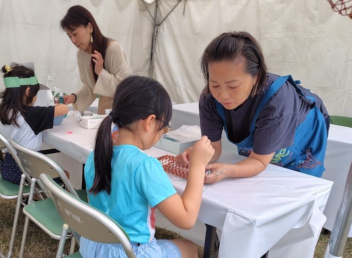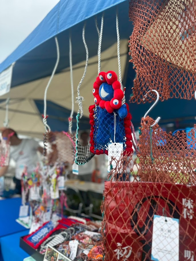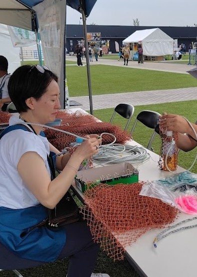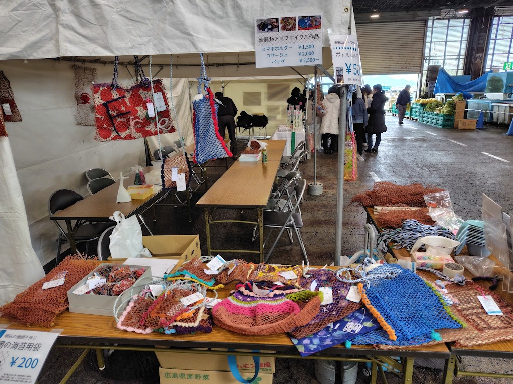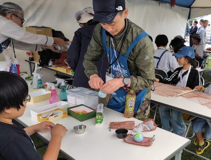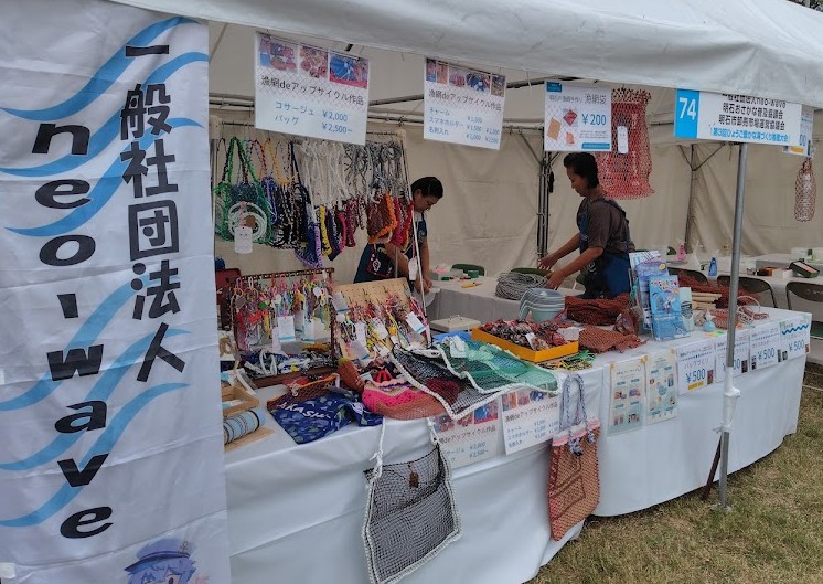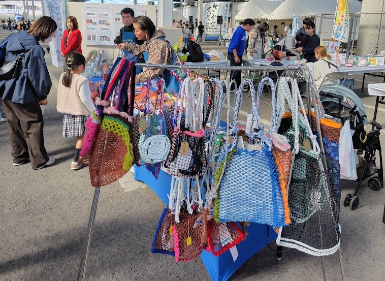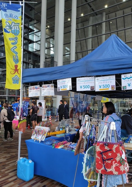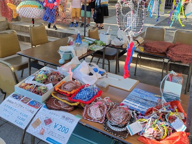 漁網作品販売、漁網ワークショップ(ボトルホルダー、バッグ、ハンモック)、豊かな海バスボムづくりを実施しました