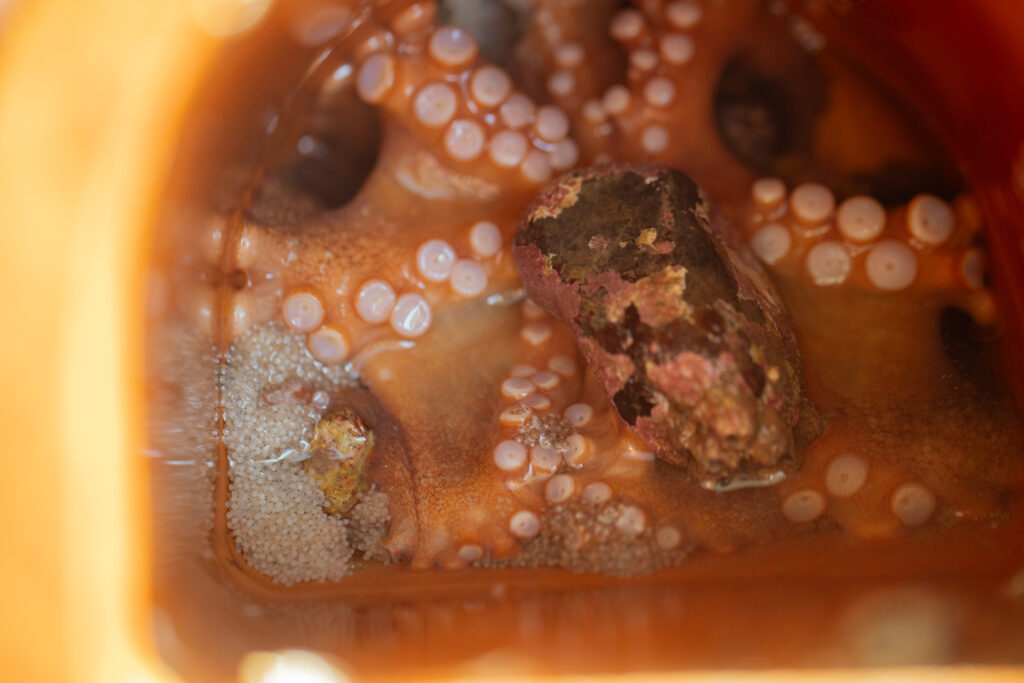 子持ちダコ再放流事業で、タコつぼごと海へ返す。