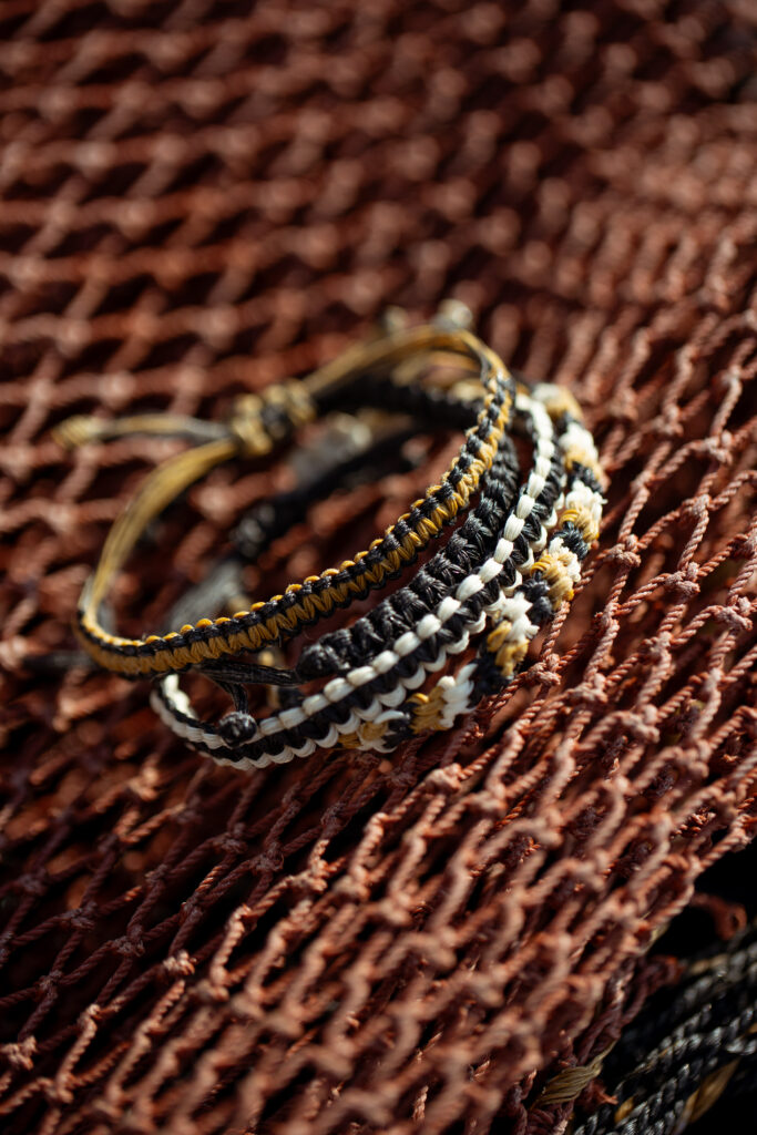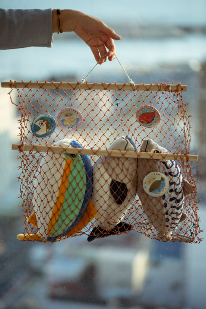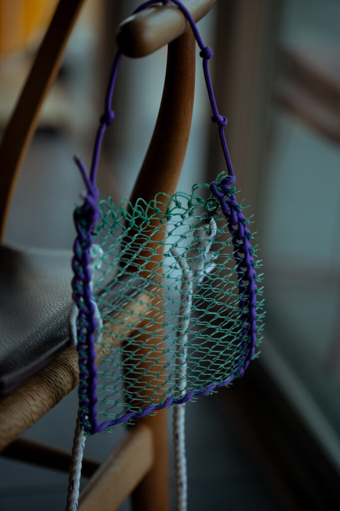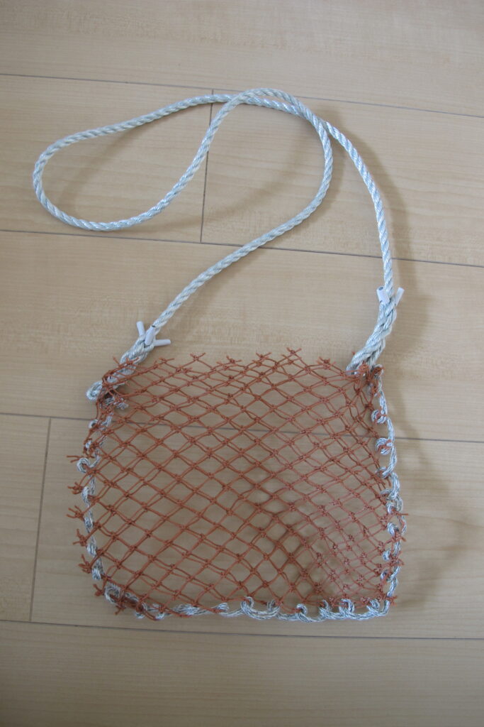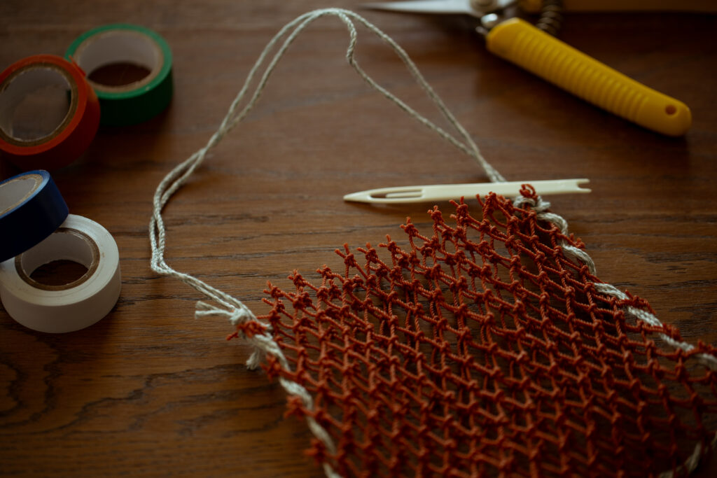 バッグとボトルホルダーでは、漁業者が日頃網の修理などで使う針と糸を使用し、「陸の漁業体験」。