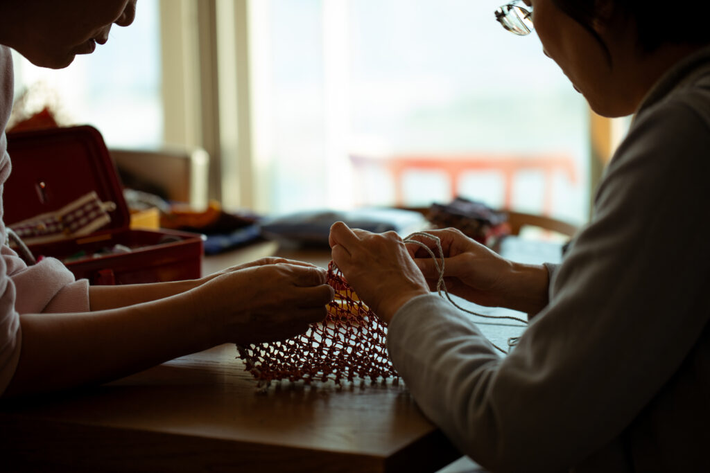 病気やけが、高齢などにより沖へ行けなくなった漁業者に、A4サイズほどの袋をつくってもらっており、陸の仕事づくりにもつながっています。
