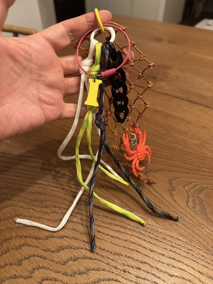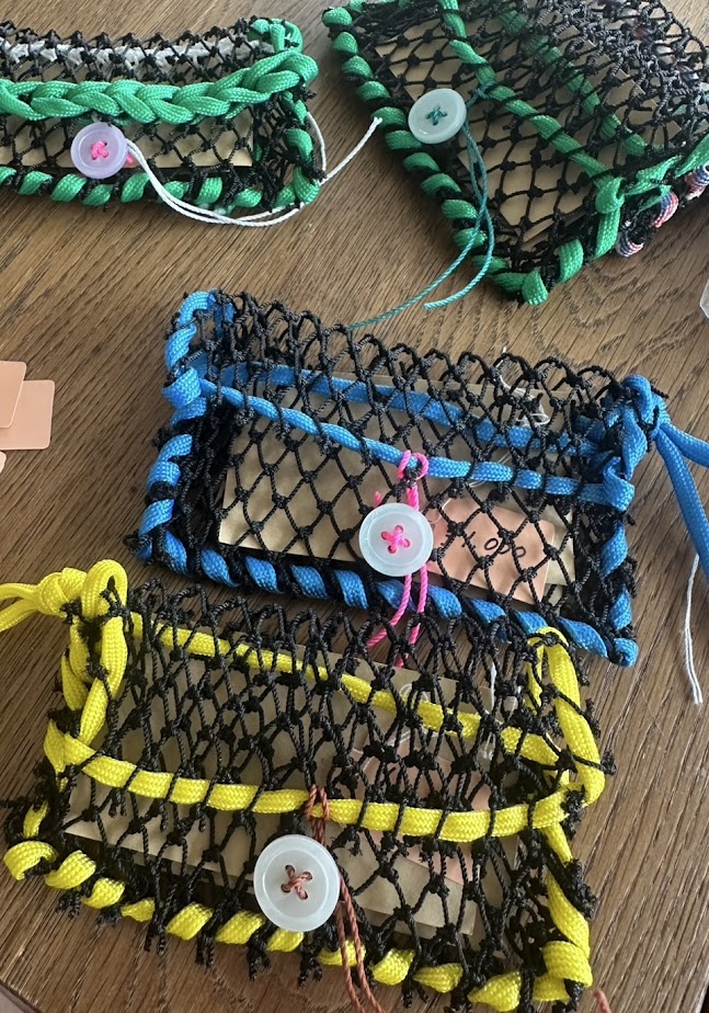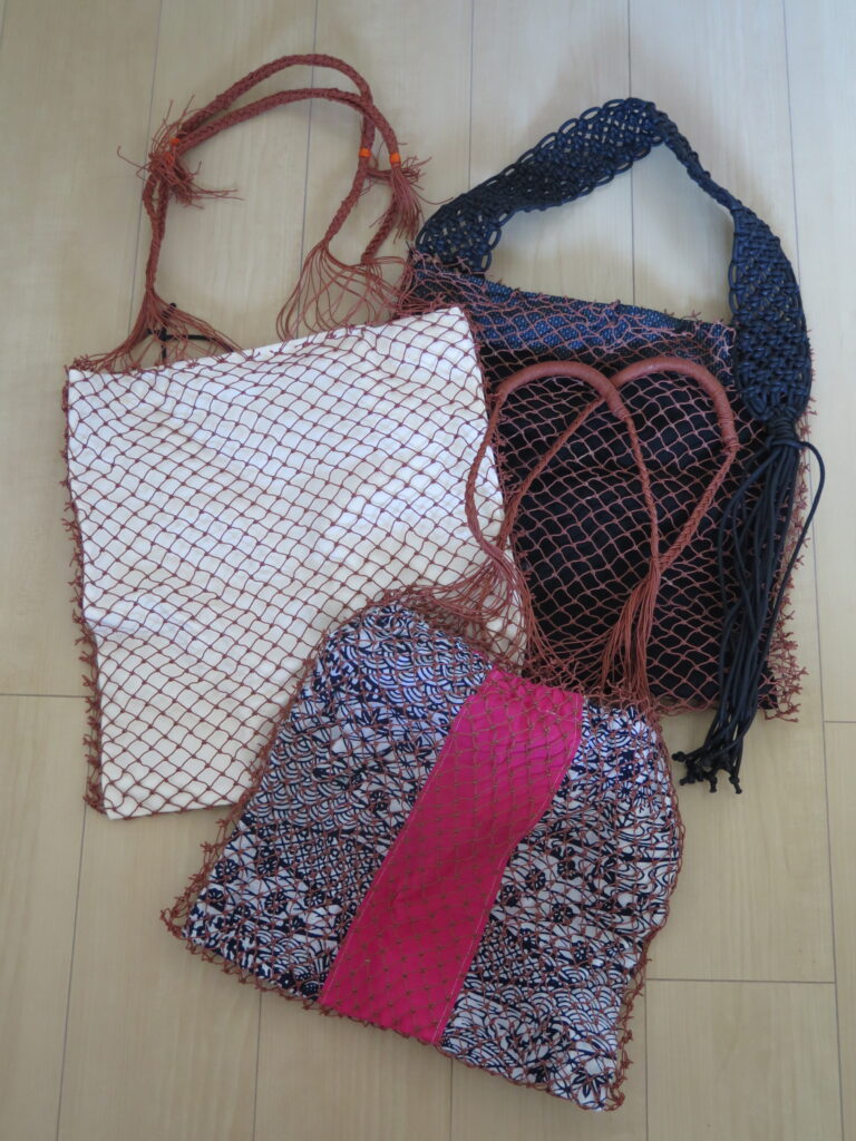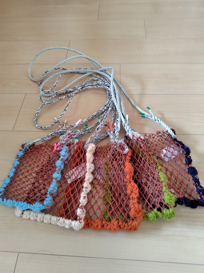 ミニバッグ、ボトルホルダー、ミニハンモック。イベントや講座で、子どもから大人まで参加できる漁網グッズづくりのワークショップを実施しています。
