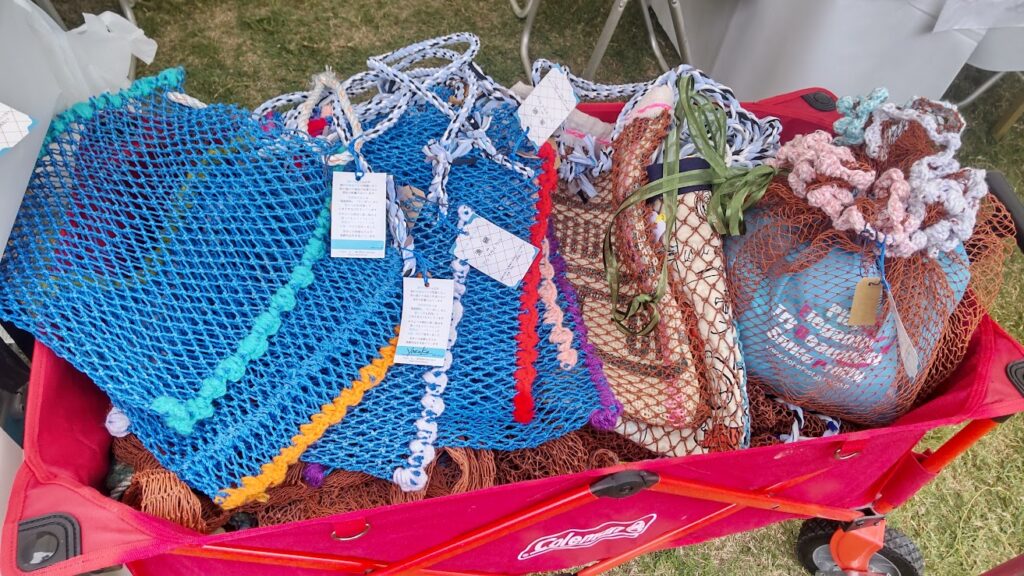 漁網は、ものづくりが得意な有志によって、バッグやコサージュなどのグッズに変身。
